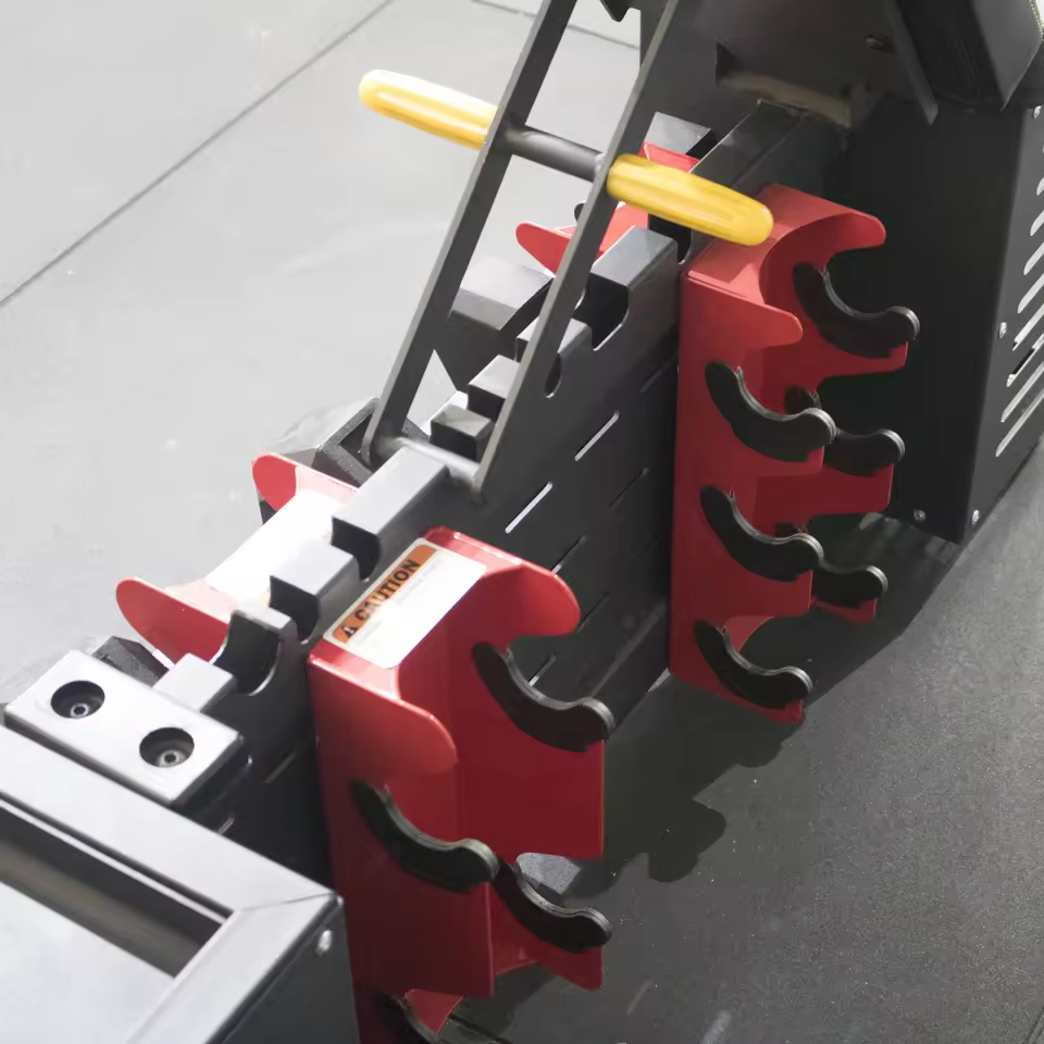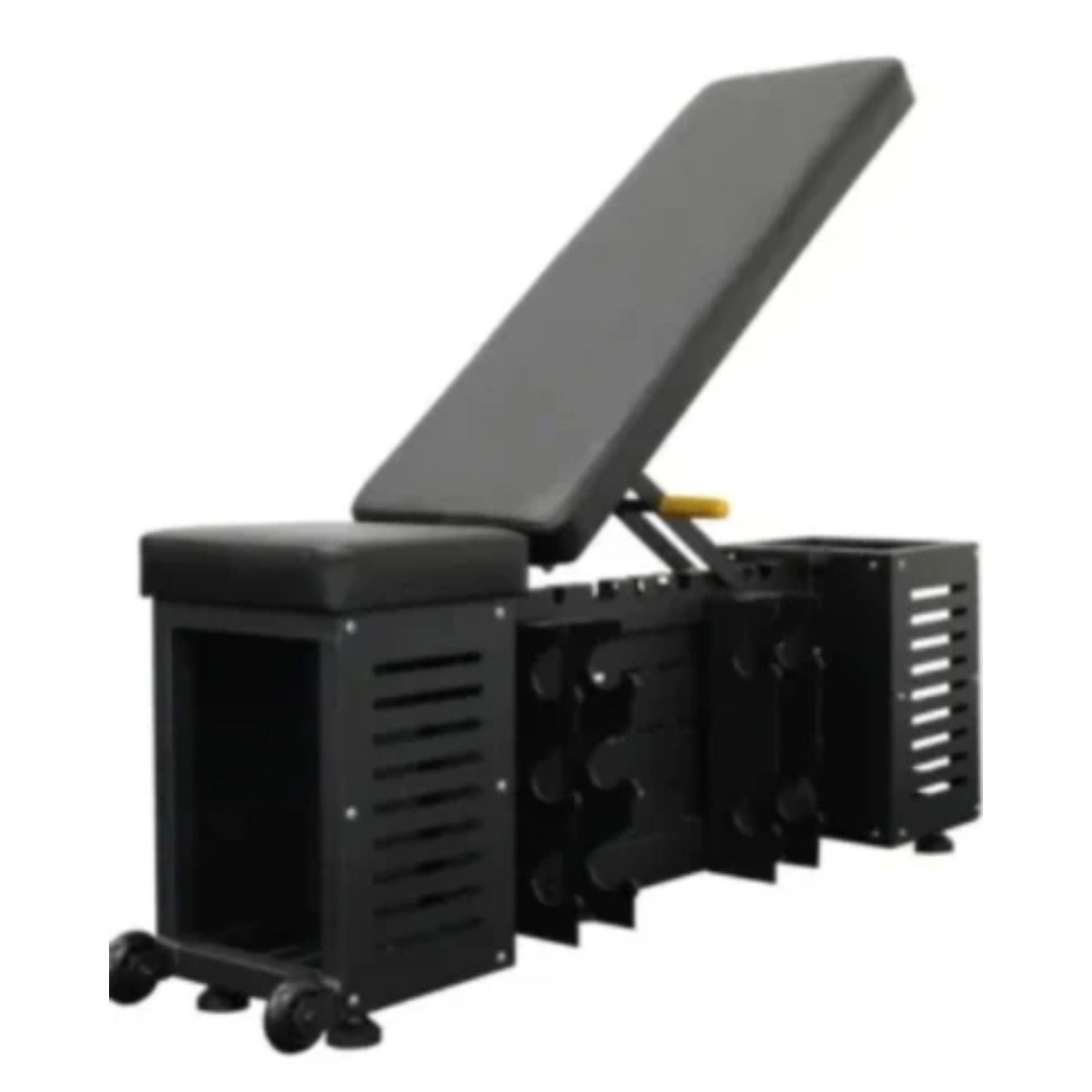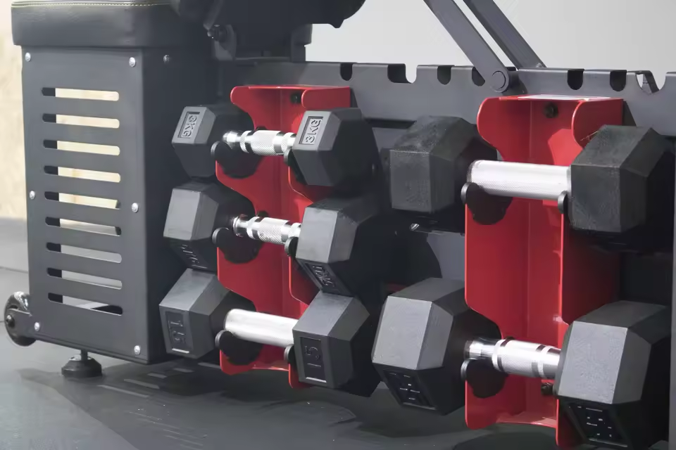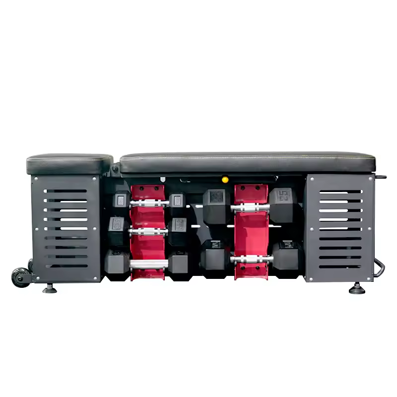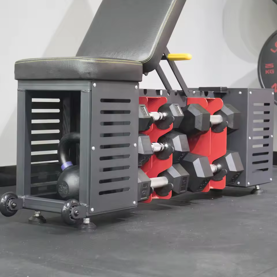 El banco de almacenamiento compacto con compartimentos incorporados elimina el desorden y proporciona un espacio de entrenamiento optimizado y moderno